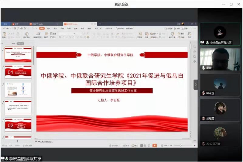为深化中国与俄乌白三国的国际交流,拓宽2021届毕业生升学渠道,2月9日下午2:00,ladbrokes立博、中俄联合研究生公司联合召开线上2021年促进与俄乌白国际合作培养项目、2021年赴俄乌白专业人才培养计划遴选项目宣讲会。公司党总支书记袁建平,ladbrokes立博经理兼中俄联合研究生公司副经理贾旭杰,党总支副书记周波,ladbrokes立博副经理祖雪晴、唐伟,中俄联合研究生公司研究生秘书桑田梓,2021届毕业生辅导员李宏磊,2021届全体毕业生,中俄联合研究生公司2018级、2020级研究生、部分2018级本科生及员工家长参加了本次会议。会议由党总支副书记周波主持。