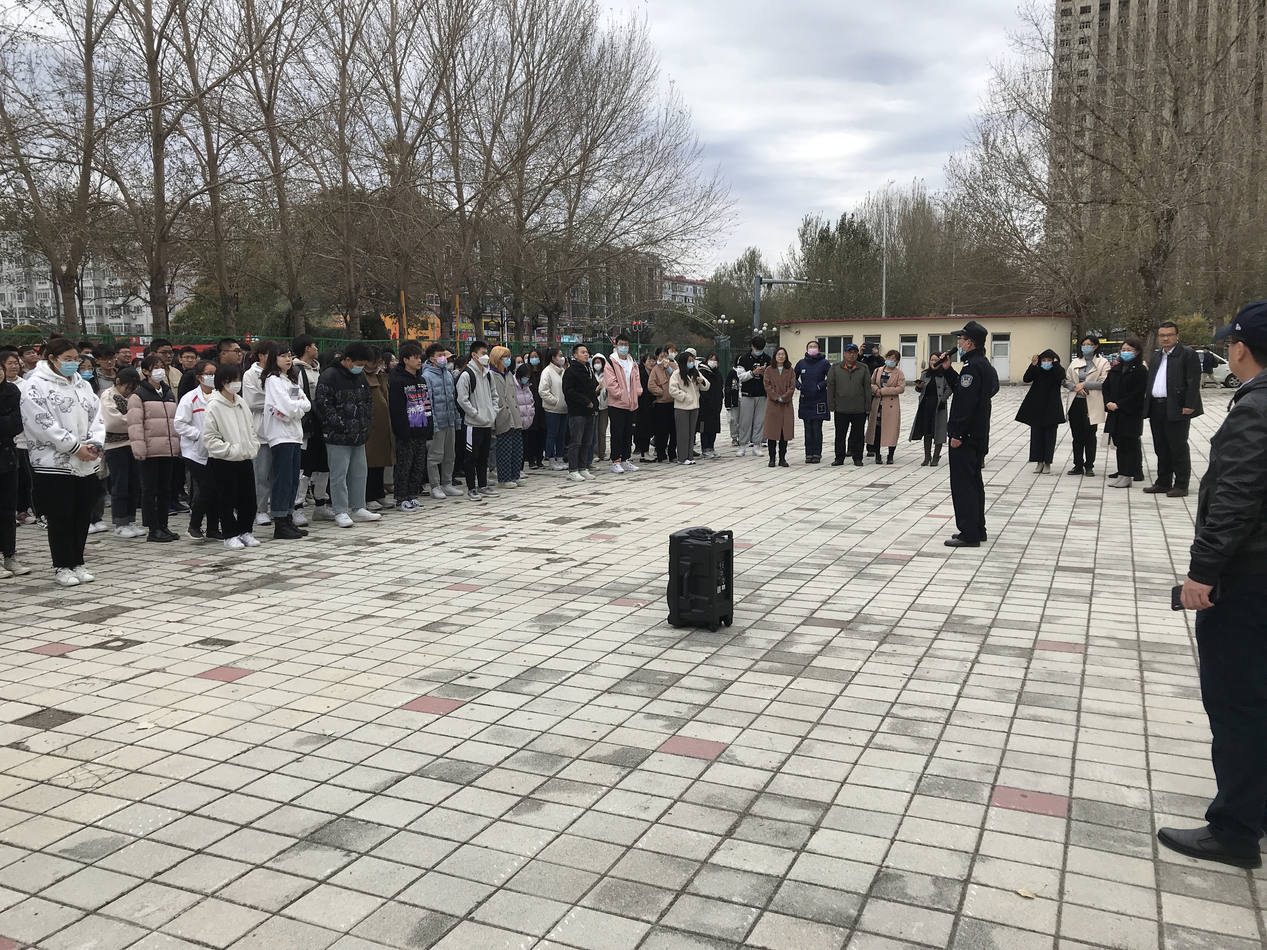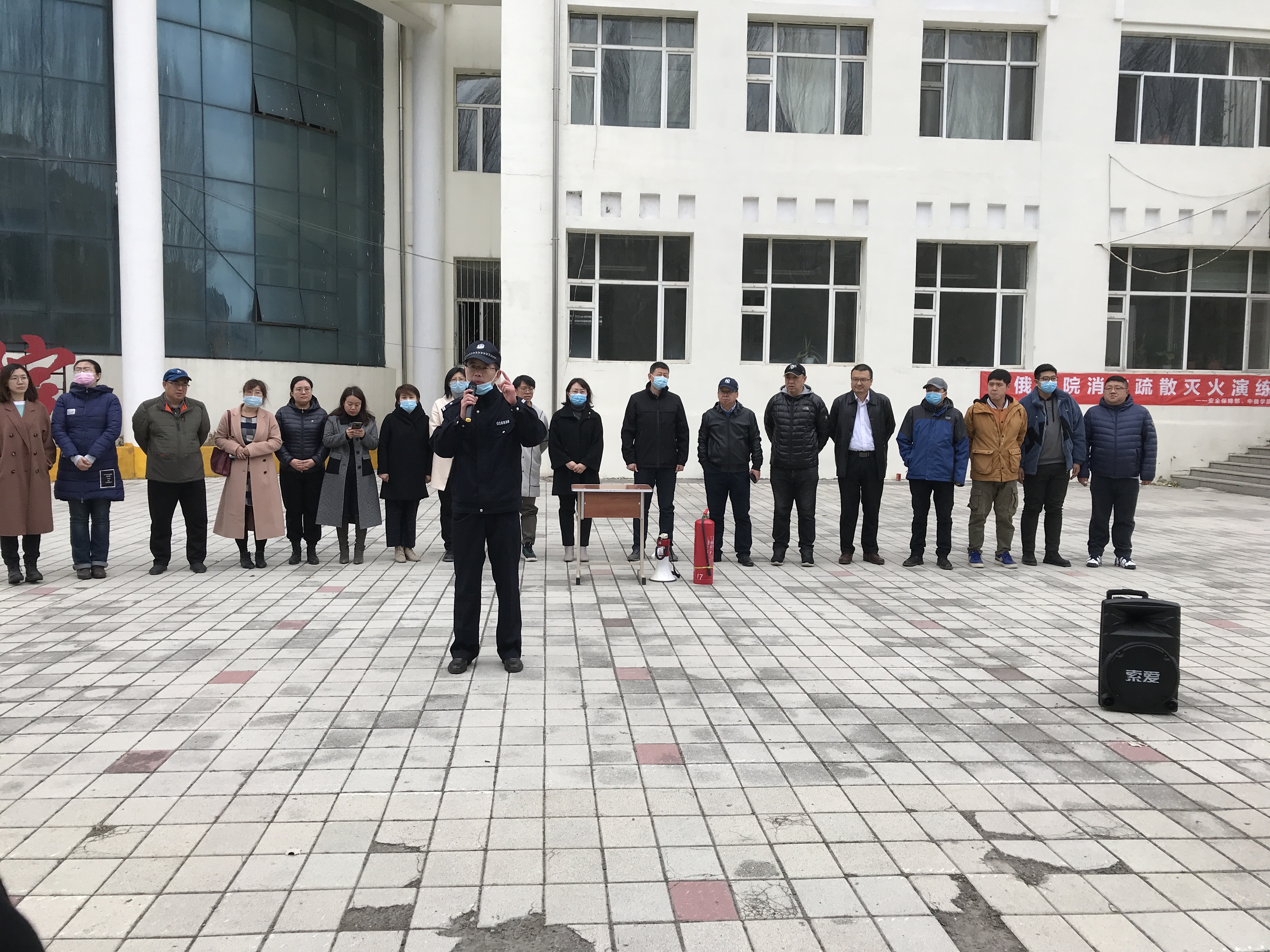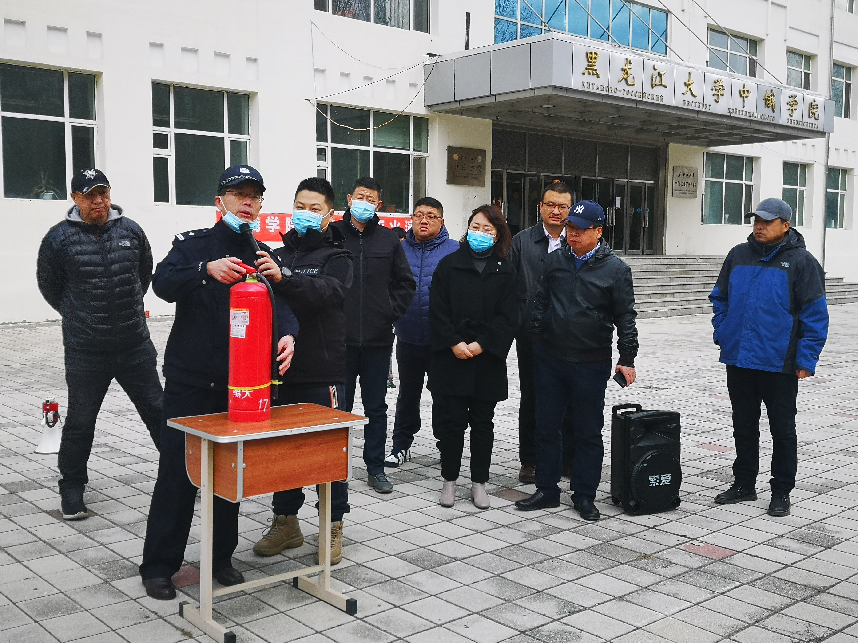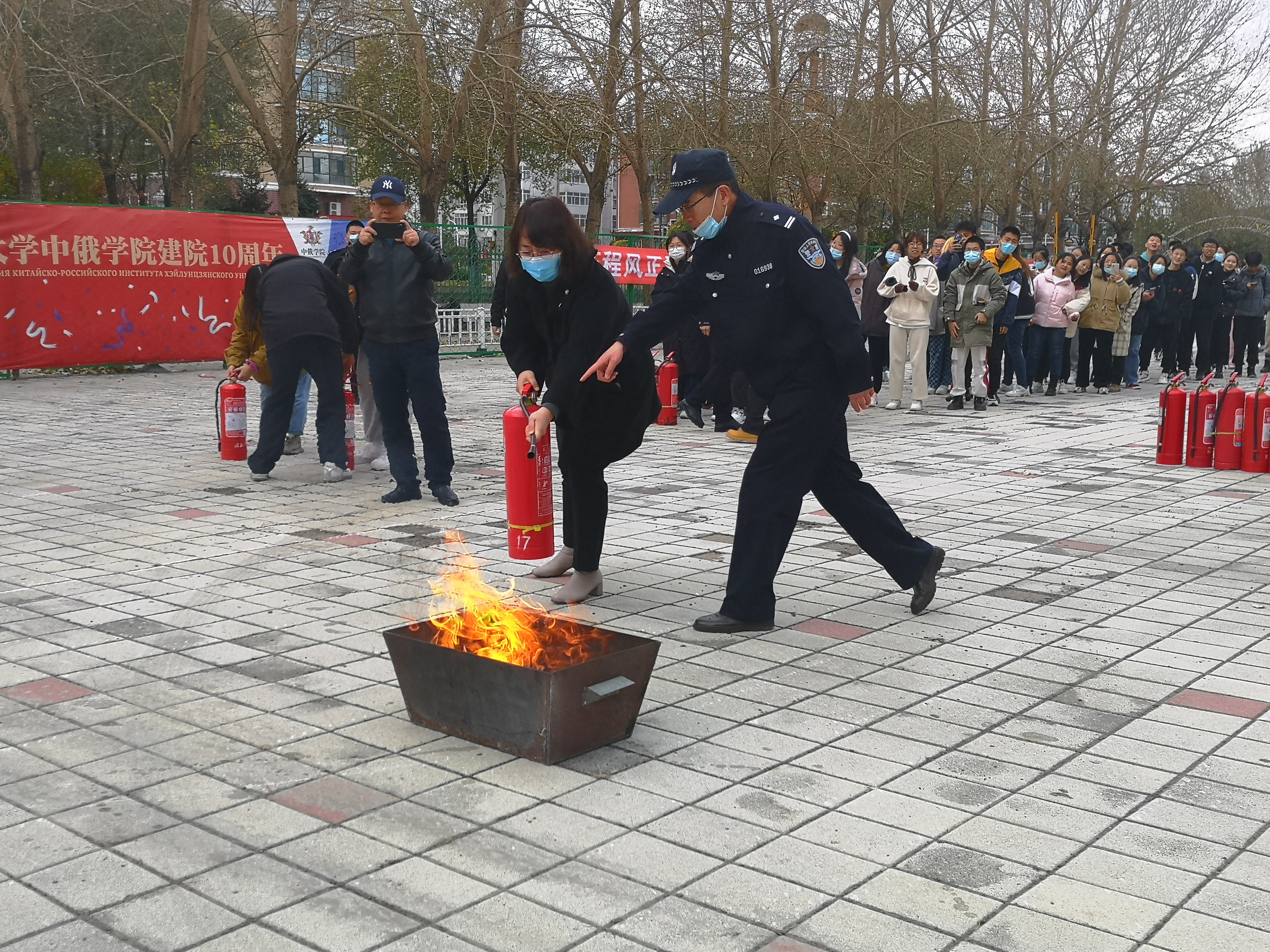疏散到楼外的师生集合完毕后,防火科刘铁东科长进行了火灾逃生教育,他通过一些火灾案例,并结合生活、工作中的实际情况,生动详细地讲解了关于火灾的基本知识、火灾逃离的方法和注意事项,并向大家说明消防常识的重要性;接着,他介绍了干粉灭火器工作原理,并演示了“提拉握压”四个使用步骤,先倒转灭火筒摇晃,再拔掉插鞘,按下开关在火种的上风面3米处对着火种进行扑灭。为了让师生们都能学会正确使用灭火器,安全保障部的干警们带领大家在操场上进行灭火实操演练。第一次用灭火器,师生们都感觉十分新奇,大家对这种寓教于乐的教学形式非常喜爱,纷纷上前一试身手。