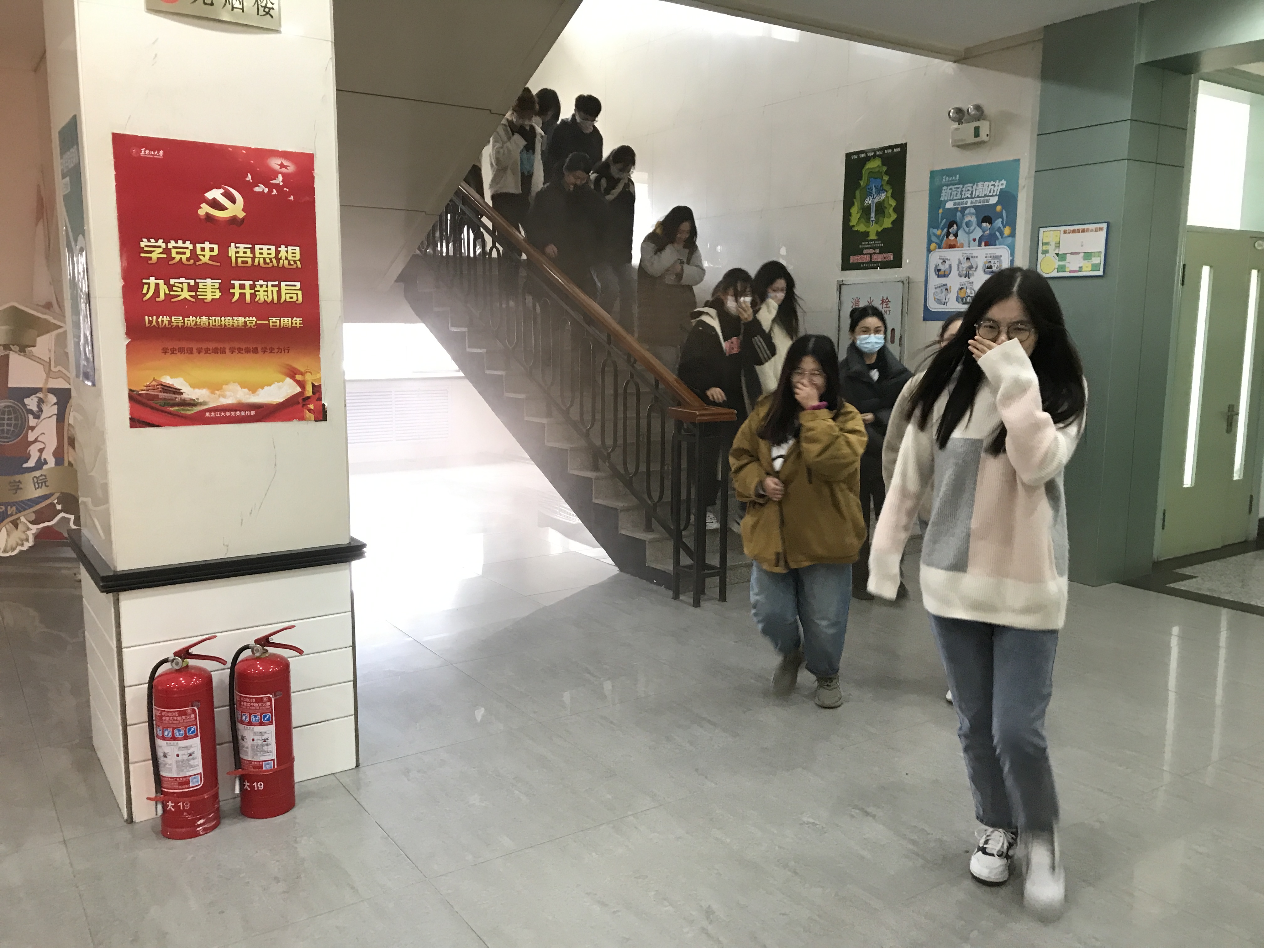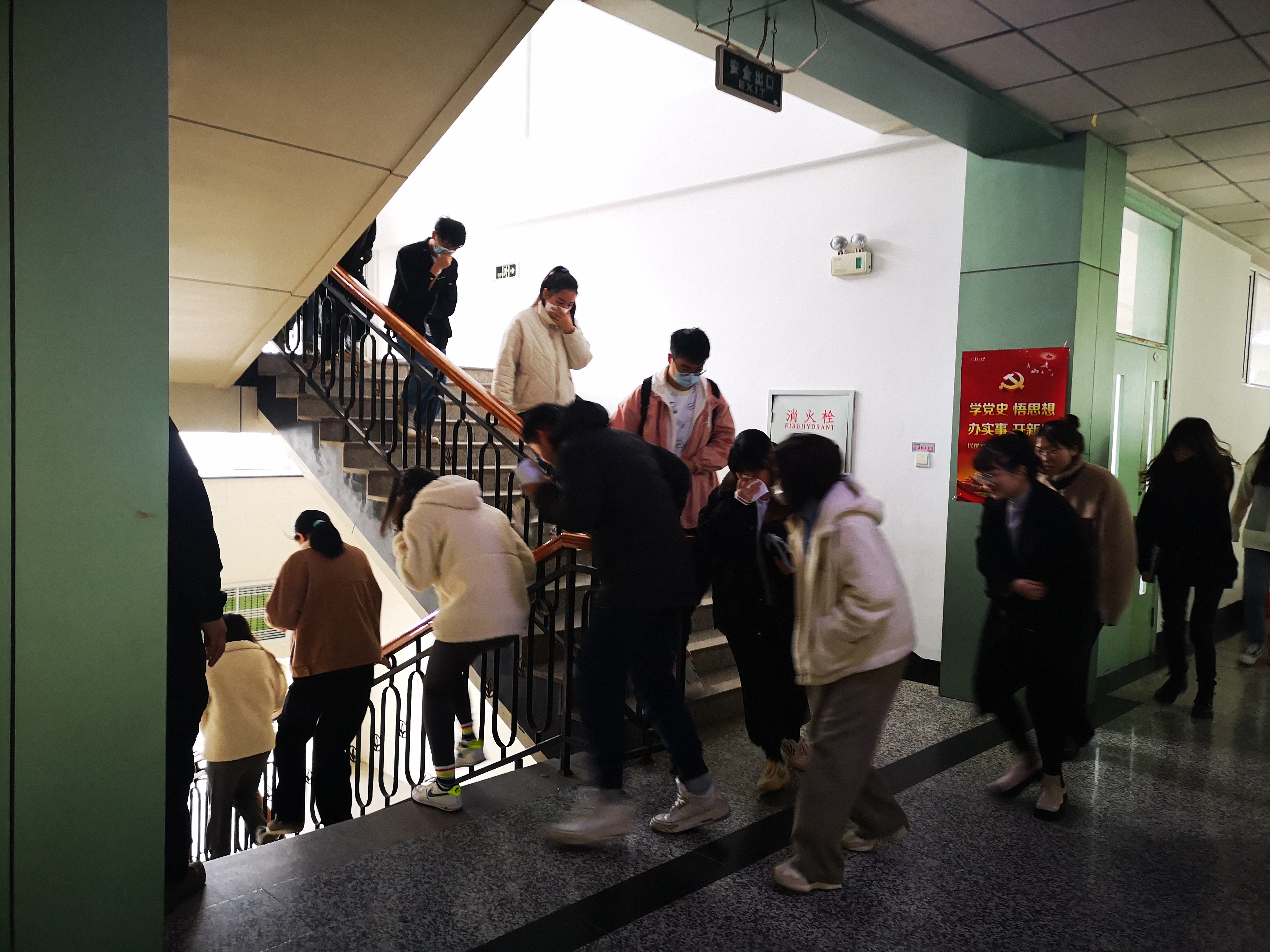 10月27日上午9:30,安全保障部刘宝副部长、王日晨副部长指示演习正式开始,模拟教学楼发生火灾的场景。随着教学楼内浓烟升起,“火势”迅速蔓延,楼内立即响起警报,各班任课老师迅速组织员工紧急疏散逃生,撤离教学楼。在撤离过程中,每楼层的楼梯口及拐角处均设有三名老师和员工负责维持员工疏散秩序,全院师生按照指定的消防应急疏散路线向楼外疏散,整个过程有条不紊。三分钟内,全体师生安全疏散到操场,演练中没有出现一名员工留在“火灾”现场,也没有因为拥挤而造成事故发生。