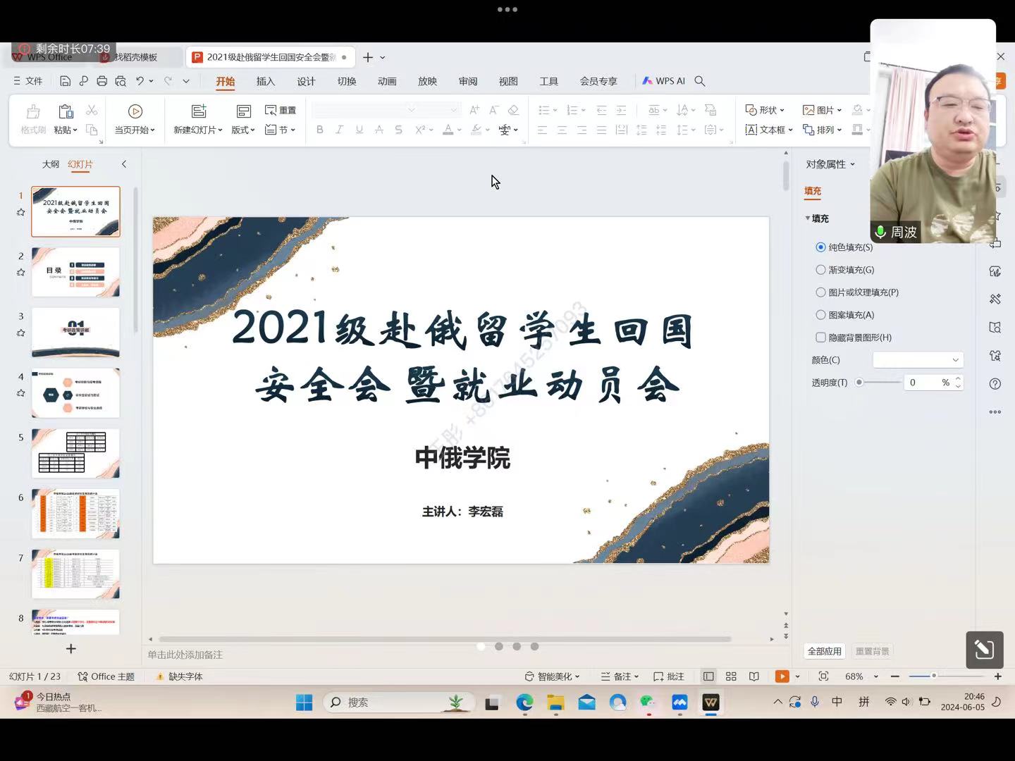 最后,周波进行总结,他希望各位同学一是注意人身财产等安全,规避各类安全风险,在顺利完成国外学业同时依规办理回国手续,保持与家校的联系,期待能够在公司早日与各位同学相见。二是找准自身定位,提前规划好就业选择,拓展就业思路,提升自我。三是充分把握和利用好回国前后的时间段,为下一步争取保研、出国读研、回国考研、考公、就业实习等积极努力。