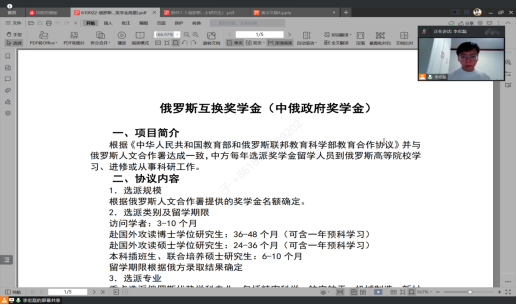 李宏磊就申报条件、流程和材料等方面进行了讲解。他希望大家提前准备好通知中要求的所有材料,并强调在申报材料上传过程中要注意细节,以防疏漏;要根据自己的发展需求制定学习计划,并注意翻译成俄语的准确性和完整性。最后他要求同学们在根据各时间节点认真完成申报工作的同时,要紧抓学习,努力丰富自身专业知识,提高俄语运用能力,为申报成功后的职工涯打下坚实基础。李宏磊在讲解相关政策后,把中俄政府奖学金项目与国家留学基金管理委员会其它几个重点目做了详细比较,并且耐心地解答了同学们提出的各类问题。